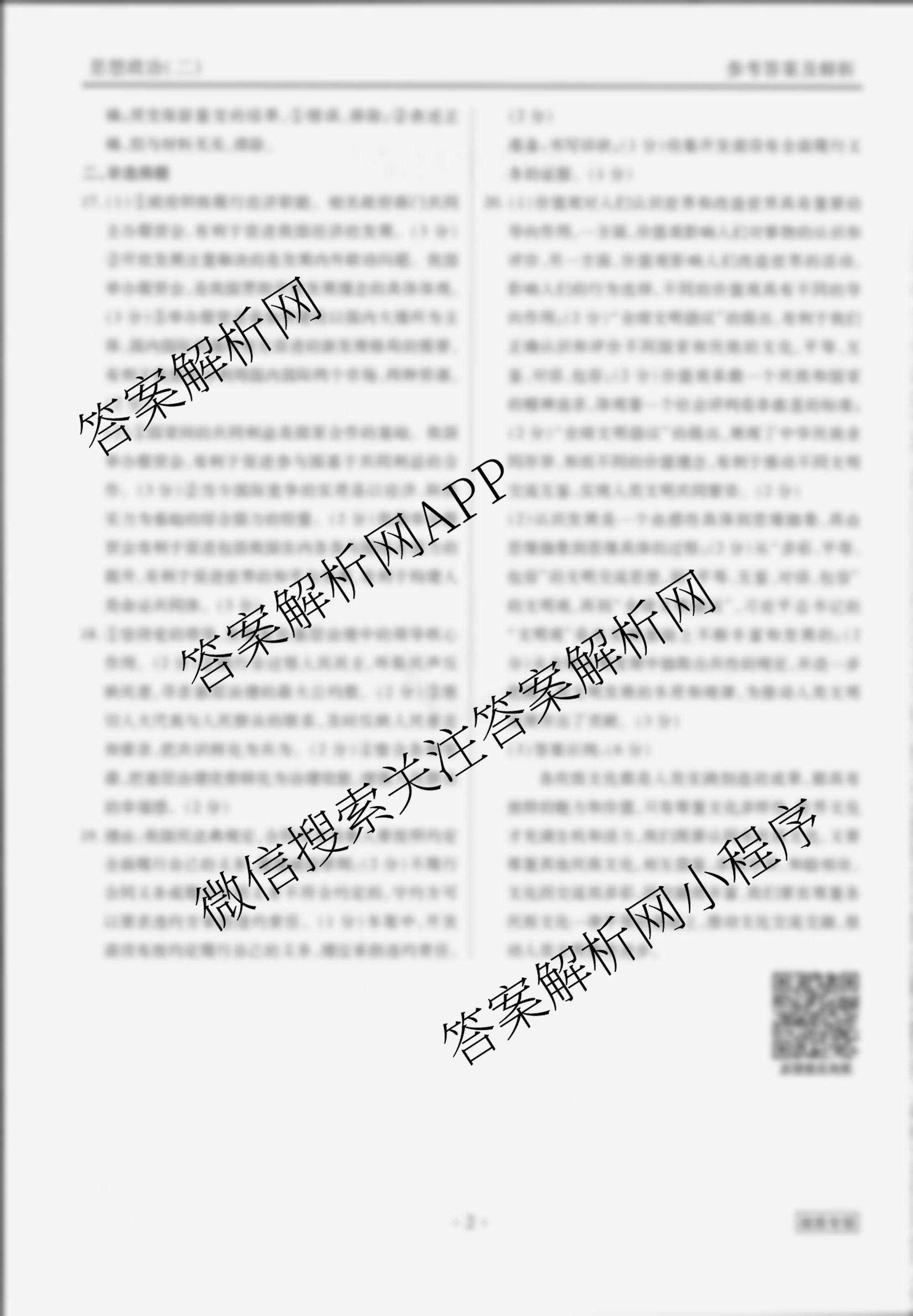 衡水金卷先享题调研卷 2024年普通高中学业水平选择性考试模拟试题(二)2政治(湖南专版)答案
