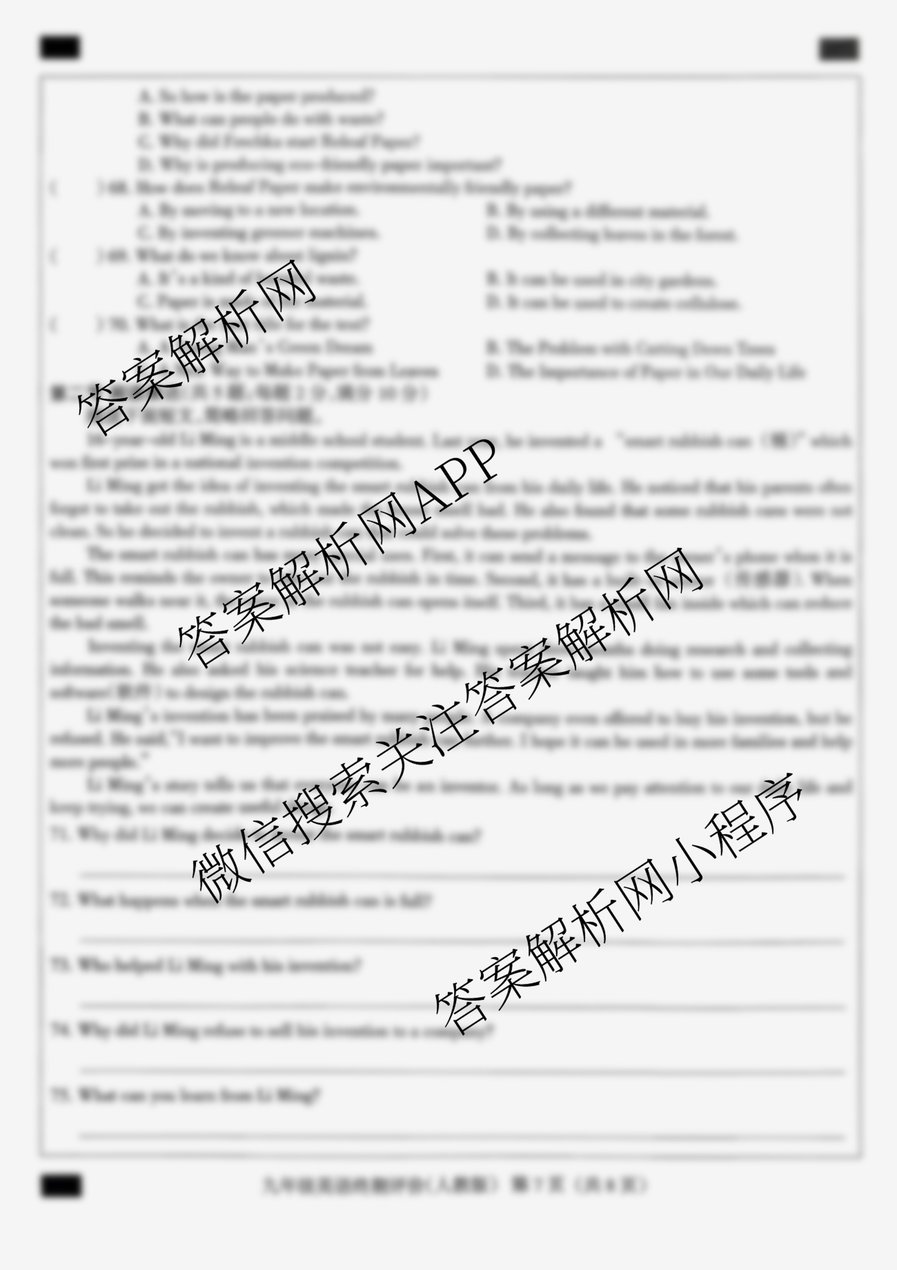 - 河北省2025~2026学年第一学期九年级学业水平终期评价英语(仁爱版)答案